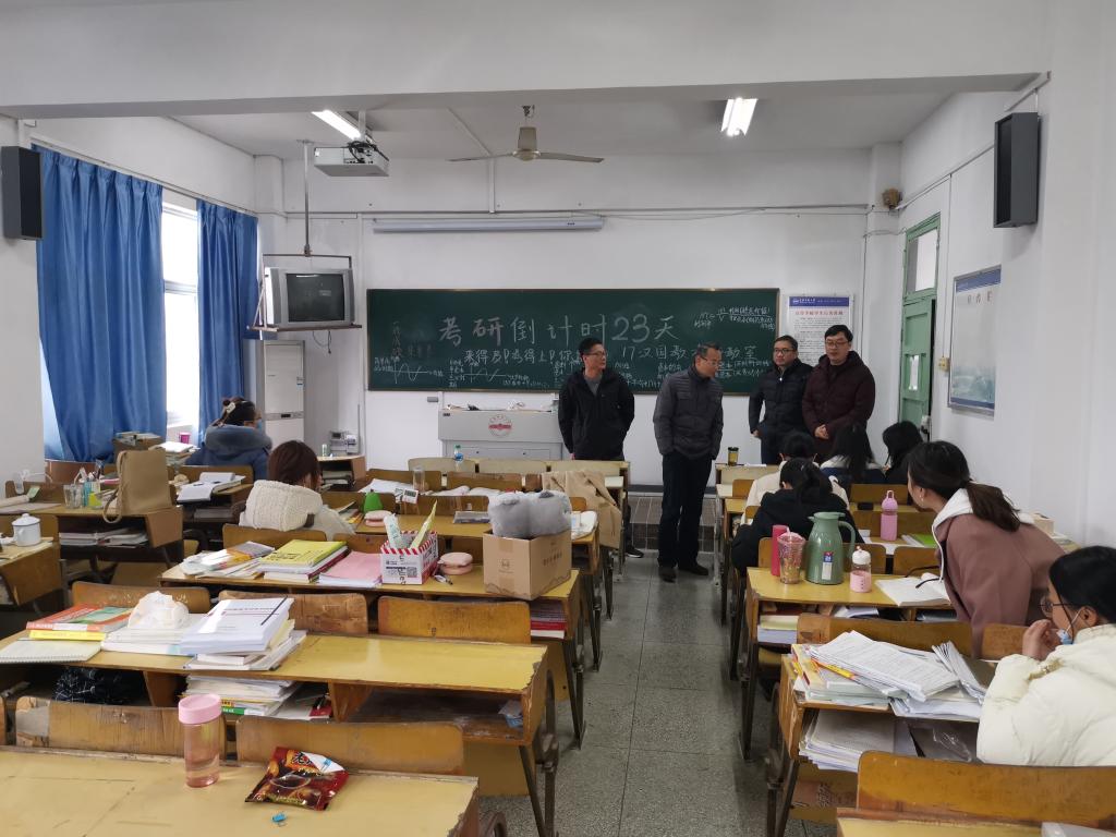 每进入一个教室,学院领导们都对考研学子的复习态度和专注表示肯定,执行院长董根明首先肯定了考研学子们的努力与付出,提醒同学们在接下来的时间要劳逸结合,注意身体,注意饮食,坚定自己的信念,保持良好的心态迎接考试。同时鼓励大家:“坚持就是胜利”。学院领导和老师们还亲切地询问了同学们在考研过程中是否遇到困难,为他们排忧解难,做好后勤工作,让同学们全身心地投入到考研中去。