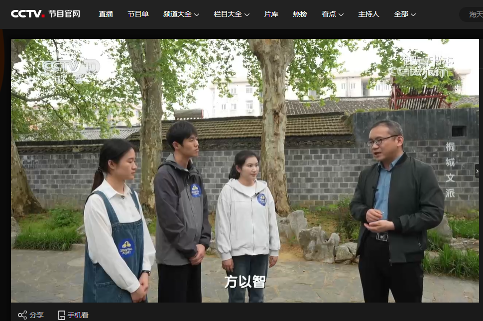 近日,由开云开云kaiyun网站师生参与录制的文化专题节目《跟着书本去旅行》在央视科教频道(CCTV-10)正式播出。本期节目聚焦桐城文派,深入安徽桐城实地取景,通过学术解读与现场探访,生动呈现了该流派的历史脉络。