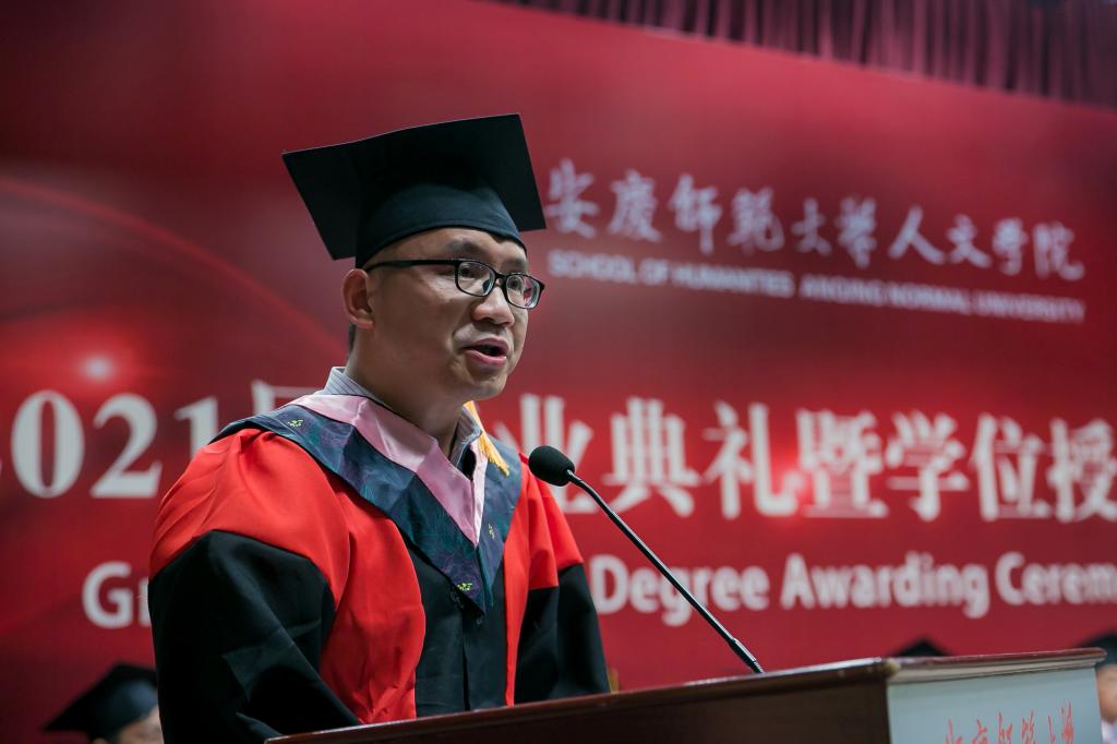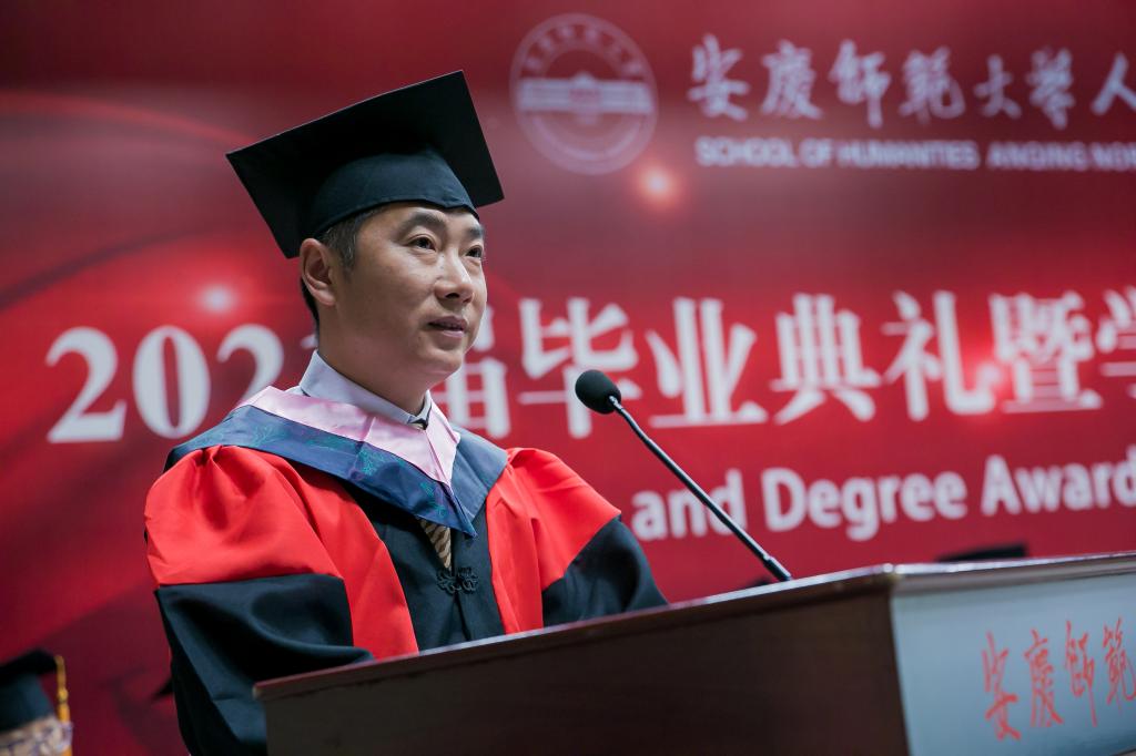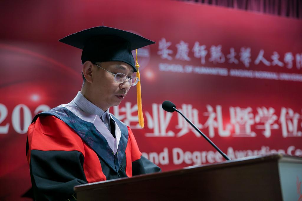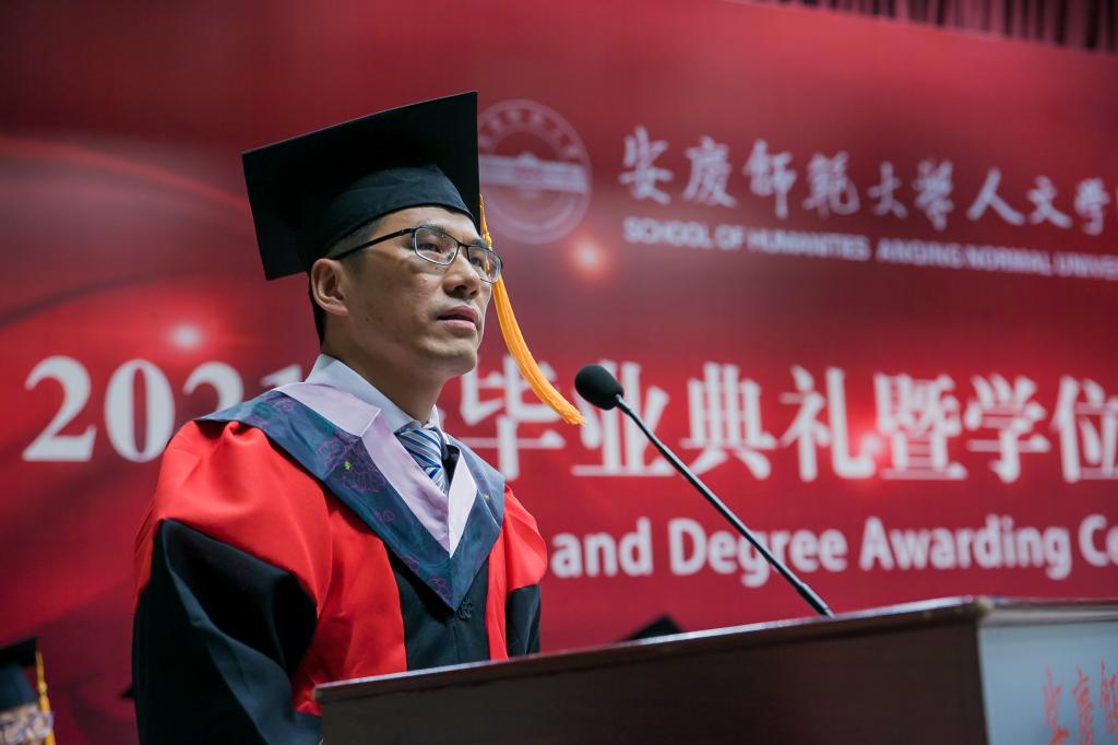 校“三全育人”最美教师、开云kaiyun网站教授、硕士生导师江飞作为教师代表为毕业生送上祝贺与期待。他勉励毕业生永远不要忘记自己作为人文知识分子身份和责任,成为一个脚下有根心中有光的人。