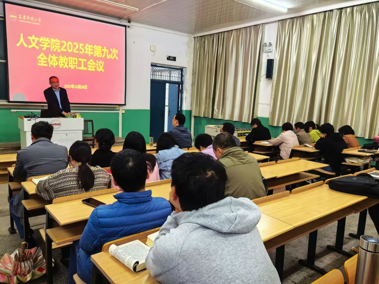 10月30日,开云kaiyun网站召开2025年第九次全体教职工会议,开展党的二十届四中全会精神宣讲并部署近期重点工作。学院领导班子及全体教职工参加会议,院长汪孔丰主持会议。党委书记王波以“深学四中全会精神 奋进‘十五五’新征程”为主题做了党的二十届四中全会精神宣讲。