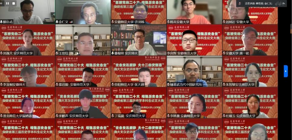为迎接党的二十大胜利召开,增强历史自觉、坚定文化自信,进一步发扬历史学专业优良传统与学科特色,提升专业人才培养质量,拓宽学术视野,激发学术热情,培养本科生科研意识与创新能力,6月25日,由安徽省历史学会和kaiyun官方登录入口开云kaiyun网站联合主办的2022年安徽省第三届历史学本科生论文大赛成功举办。因受疫情影响,本次论文大赛采用线上方式举行,来自全省各高校历史学专业师生100余人相聚云端、共襄盛会。