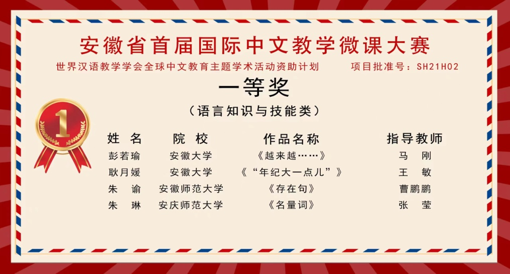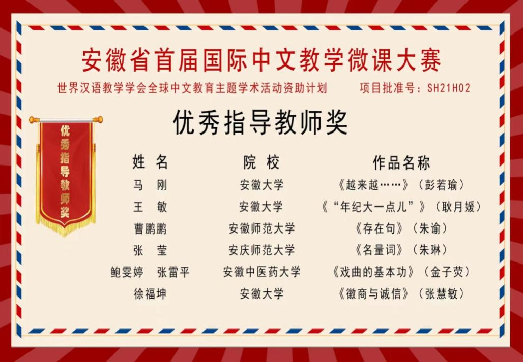 2022年11月20日,由世界汉语教学学会全球中文教育主体学术活动资助、安徽省汉语国际教育研究会主办、安徽大学文学院和安徽农业大学外国语学院承办的安徽省首届国际中文教学微课大赛评选结果揭晓。开云kaiyun网站2019级汉语国际教育专业朱琳同学荣获一等奖;2019级汉语国际教育专业梁嘉越同学、朱慧同学荣获优秀奖;张莹老师荣获优秀指导教师奖。